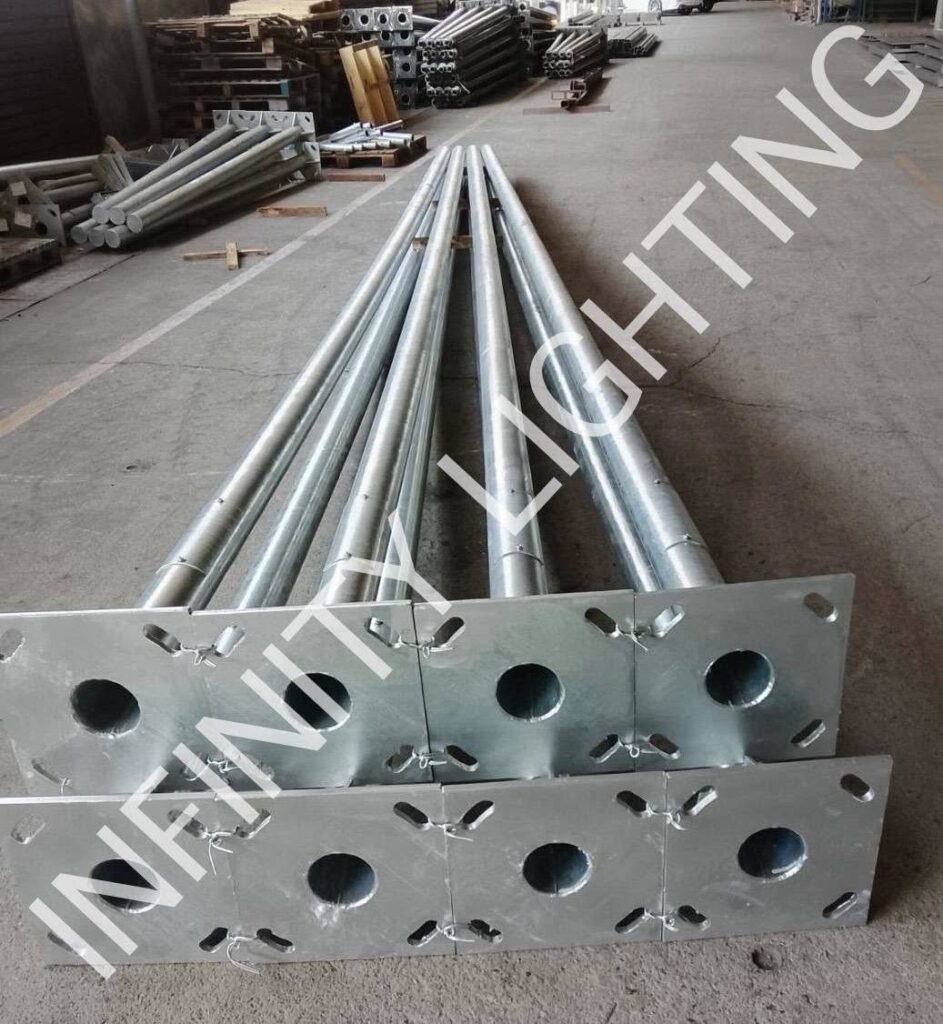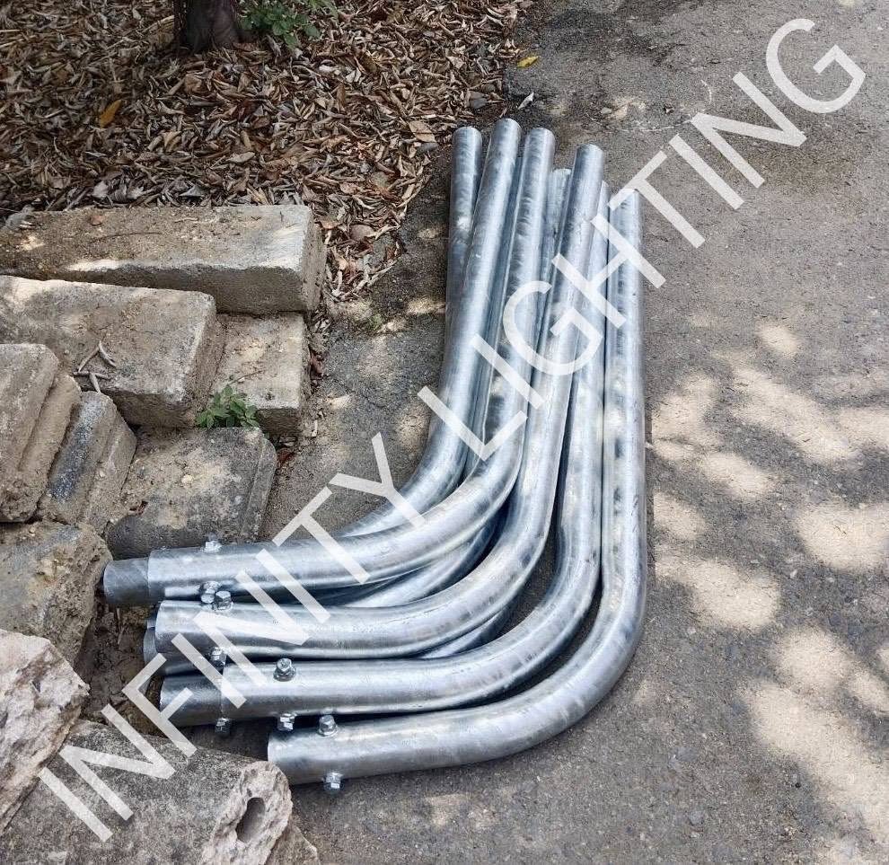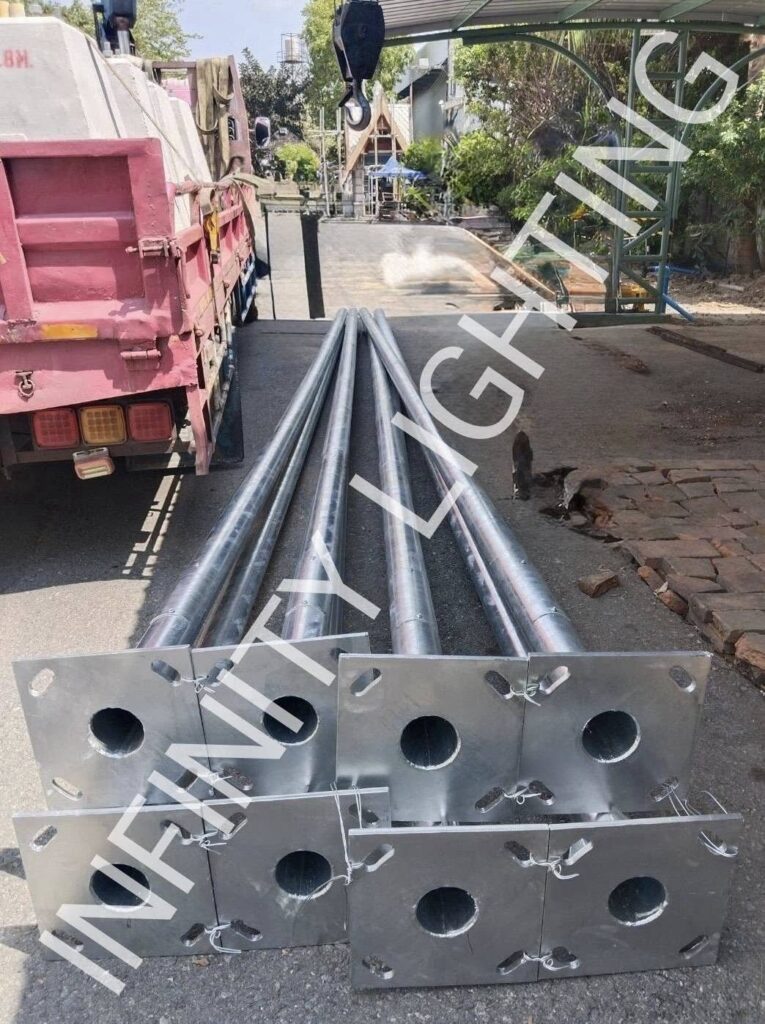 งานเสากลม 4″ สูง 8 เมตร กิ่งเดี่ยวยื่น 1 เมตร ชุบกัลวาไนซ์ พร้อมโคมถนนโซล่า 80W